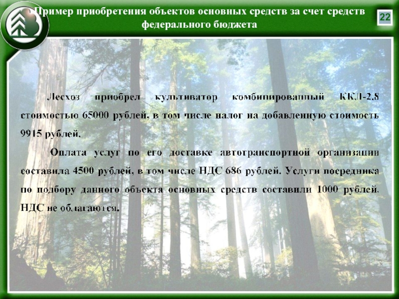 Лесхоз приобрел лесовозный автомобиль УРАЛ-375 стоимостью 1075000 рублей, кроме того, налог на добавленную стоимость 193500 рублей. Всего 1268500 рублей. Оплата произведена на основании выставленного продавцом счета № 229 от 28 августа 2006 года, счета-фактуры № 447 от 28 августа 2006 года и государственного контракта от 26 августа 2006 года № ГК-11/2006.