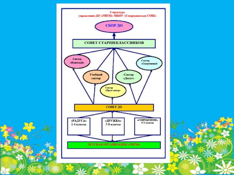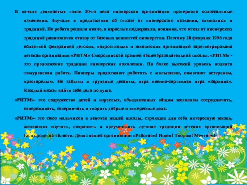 «РИТМ»- это союз мальчиков и девочек нашей школы, строящих для себя интересную жизнь, желающих изучить, сохранить и преумножить лучшие традиции детских организаций Белгородской области. Девиз нашей организации «Работаем! Ищем! Творим! Мечтаем!»