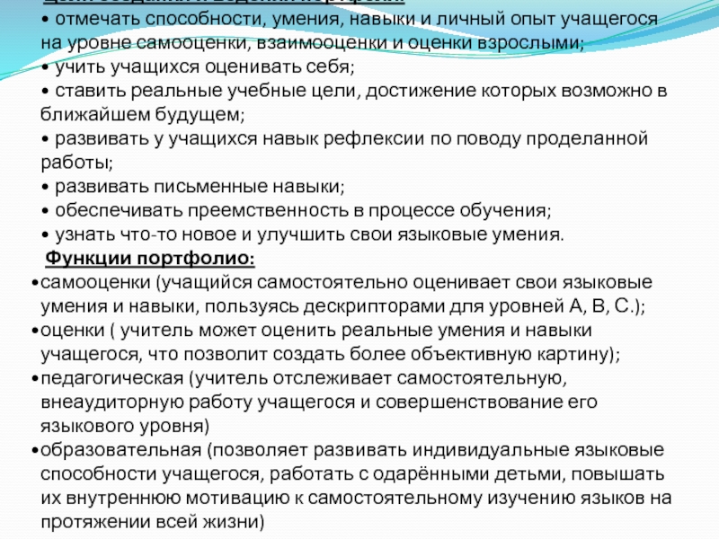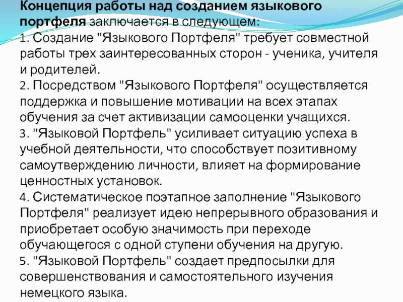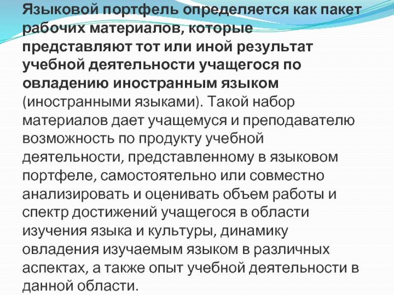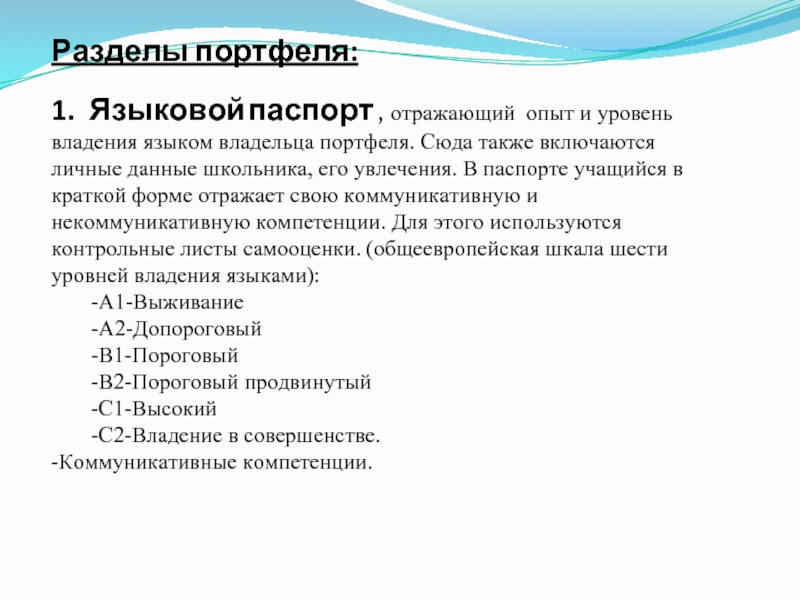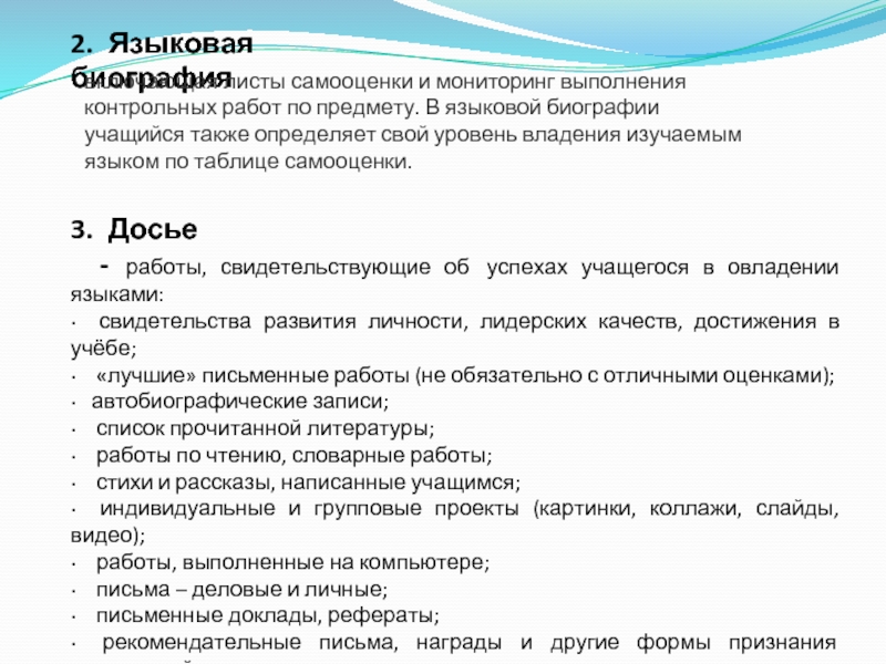 включающая листы самооценки и мониторинг выполнения контрольных работ по предмету. В языковой биографии учащийся также определяет свой уровень владения изучаемым языком по таблице самооценки.