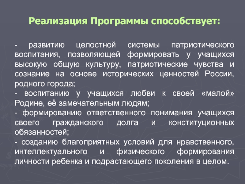 - развитию целостной системы патриотического воспитания, позволяющей формировать у