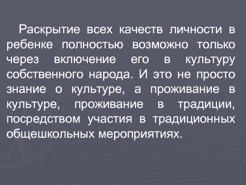 его в культуру собственного народа. И это не просто знание о культуре, а проживание в культуре, проживание в традиции, посредством участия в традиционных общешкольных мероприятиях.