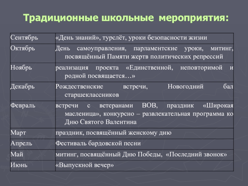 разработана система традиционных общешкольных мероприятий и творческих проектов;