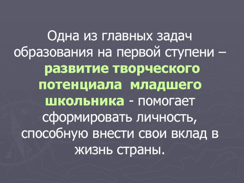 потенциала младшего школьника - помогает сформировать личность, способную внести свои вклад в жизнь страны.