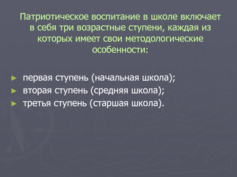 Слайд 16Патриотическое воспитание в школе включает в себя три возрастные ступени, каждая