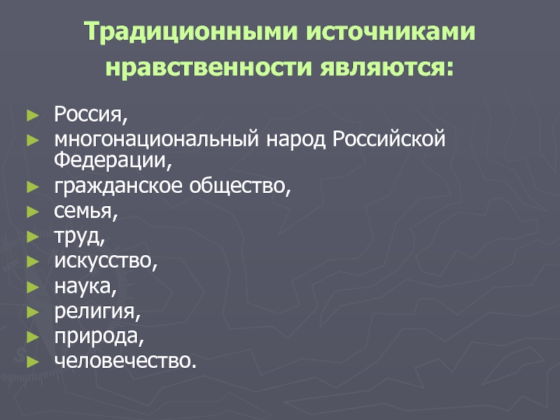 как добросовестность, честность, мужество, уважение к старшему поколению, любовь к Родине и своему народу;
