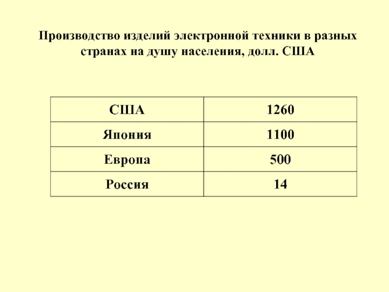 Слайд 19Производство изделий электронной техники в разных странах на душу населения, долл.