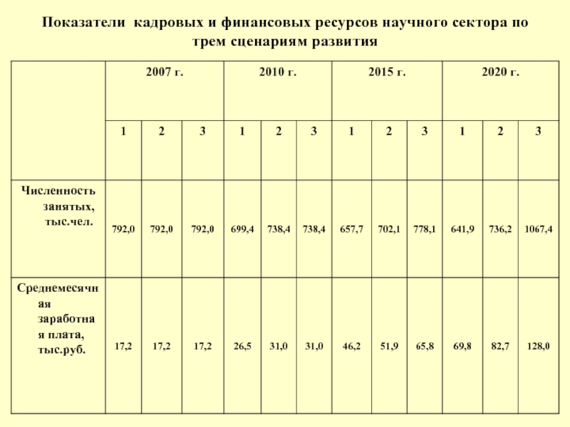 Слайд 43Показатели кадровых и финансовых ресурсов научного сектора по трем сценариям развития