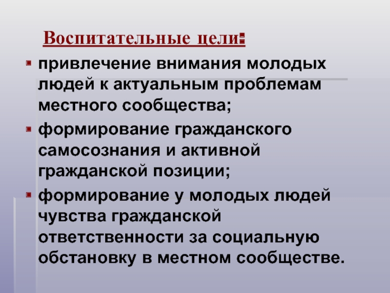 привлечение внимания молодых людей к актуальным проблемам местного сообщества;