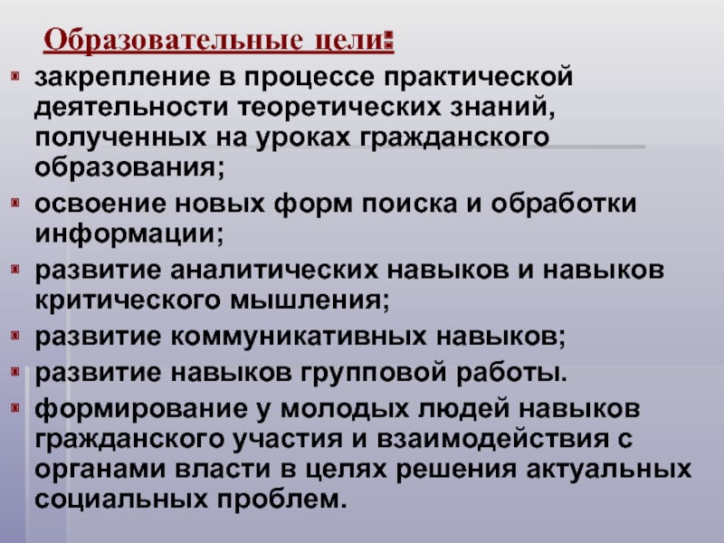 формирование у молодых людей навыков гражданского участия и взаимодействия с органами власти в целях решения актуальных социальных проблем.