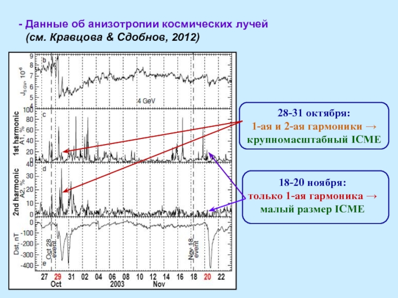 - Сочетание сильнешей бури (Dst≈-422 нТл) с относительно небольшим Форбуш-понижением (≈4,7 %)