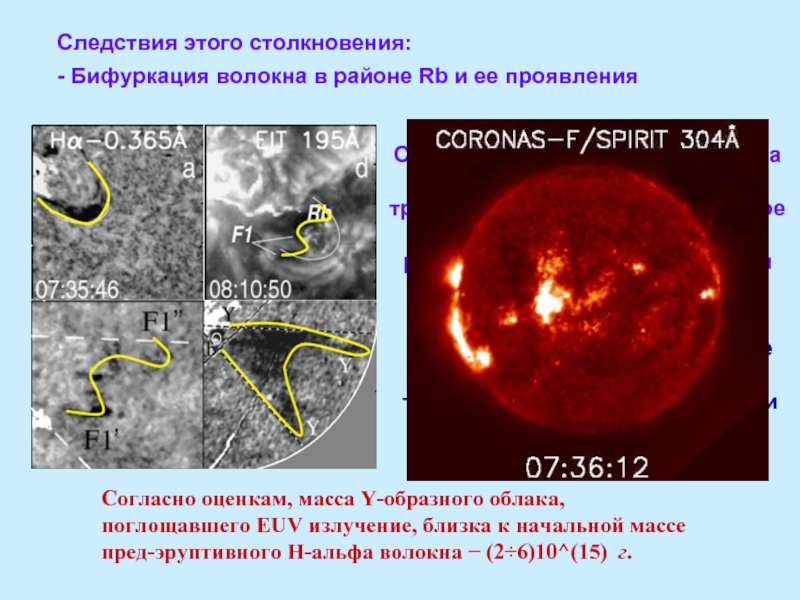 Согласно оценкам, масса Y-образного облака, поглощавшего EUV излучение, близка к начальной массе пред-эруптивного Н-альфа волокна − (2÷6)10^(15) г.