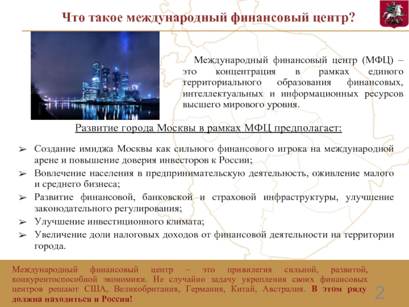 Международный финансовый центр (МФЦ) – это концентрация в рамках единого территориального образования финансовых, интеллектуальных и информационных ресурсов высшего мирового уровня.