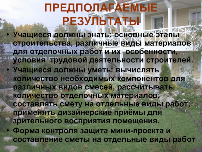 Учащиеся должны уметь: вычислять количество необходимых компонентов для различных видов смесей, рассчитывать количество отделочных материалов, составлять смету на отдельные виды работ, применять дизайнерские приёмы для зрительного восприятия помещения.