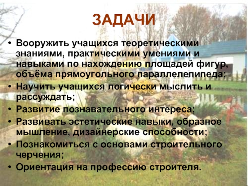 Вооружить учащихся теоретическими знаниями, практическими умениями и навыками по нахождению площадей