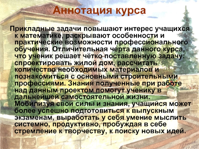 и практические возможности профессионального обучения. Отличительная черта данного курса, что ученик решает чётко поставленную задачу: спроектировать жилой дом, рассчитать количество необходимых материалов и познакомиться с основными строительными профессиями. Знания полученные при работе над данным проектом помогут ученику в дальнейшей самостоятельной жизни. Мобилизуя свои силы и знания, учащийся может более успешно подготовиться к выпускным экзаменам, выработать у себя умение мыслить системно, продуктивно, пробуждая в себе стремление к творчеству, к поиску новых идей.