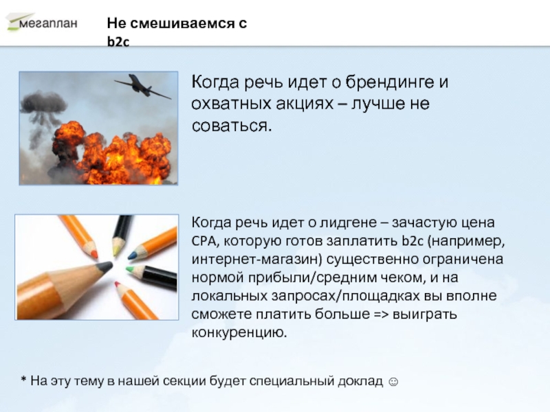 Когда речь идет о лидгене – зачастую цена CPA, которую готов заплатить b2c (например, интернет-магазин) существенно ограничена нормой прибыли/средним чеком, и на локальных запросах/площадках вы вполне сможете платить больше => выиграть конкуренцию.