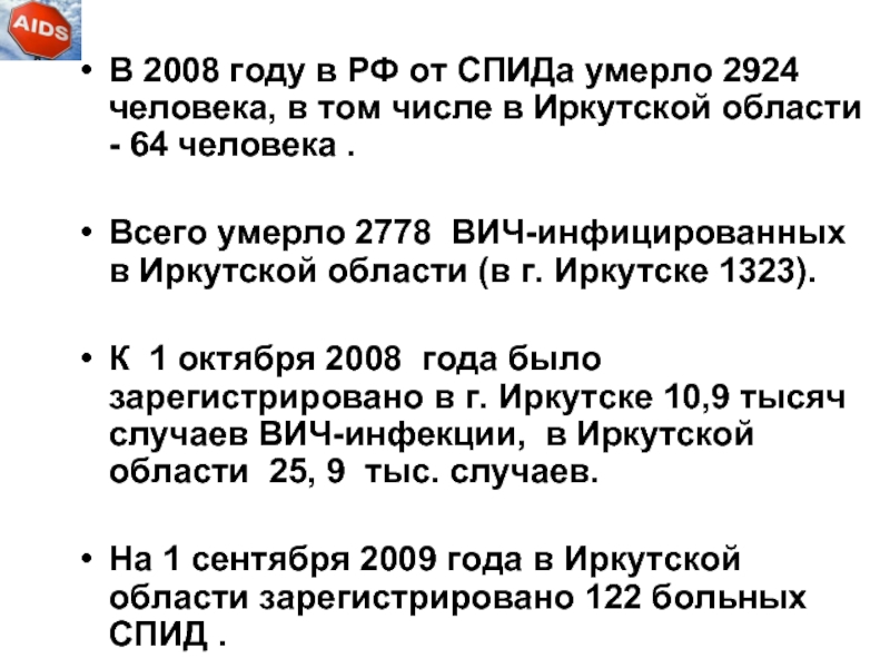 К 1 октября 2008 года было зарегистрировано в г. Иркутске 10,9 тысяч случаев ВИЧ-инфекции, в Иркутской области 25, 9 тыс. случаев.