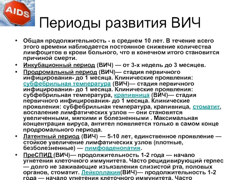 Продромальный период (ВИЧ)— стадия первичного инфицирования- до 1 месяца. Клинические проявления: субфебрильная температура (ВИЧ)— стадия первичного инфицирования- до 1 месяца. Клинические проявления: субфебрильная температура, крапивница (ВИЧ)— стадия первичного инфицирования- до 1 месяца. Клинические проявления: субфебрильная температура, крапивница, стоматит, воспаление лимфатических узлов — они становятся увеличенными, мягкими и болезненными . Максимальная концентрация вируса, антител появляется только в самом конце продромального периода.