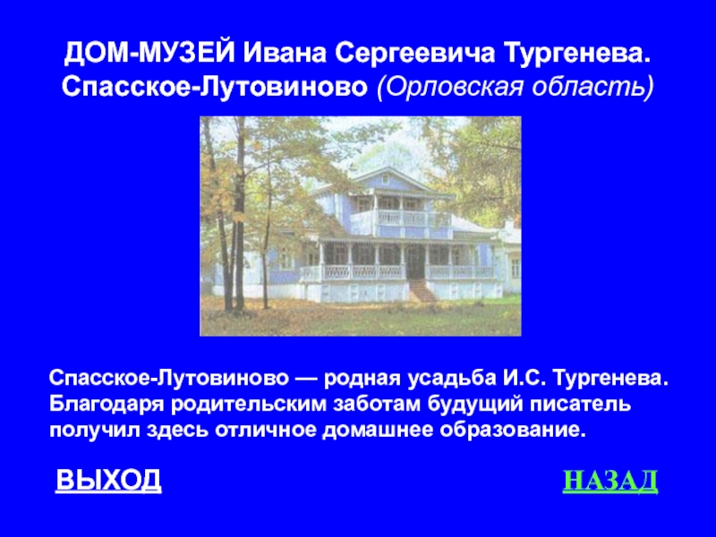 Тургенева. Благодаря родительским заботам будущий писатель получил здесь отличное домашнее образование.