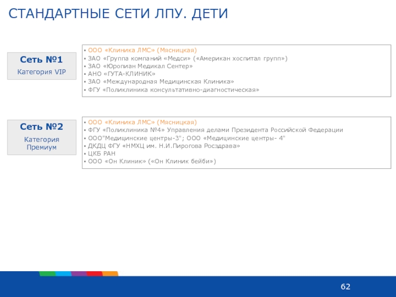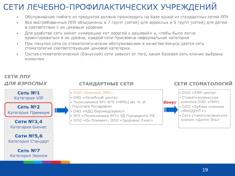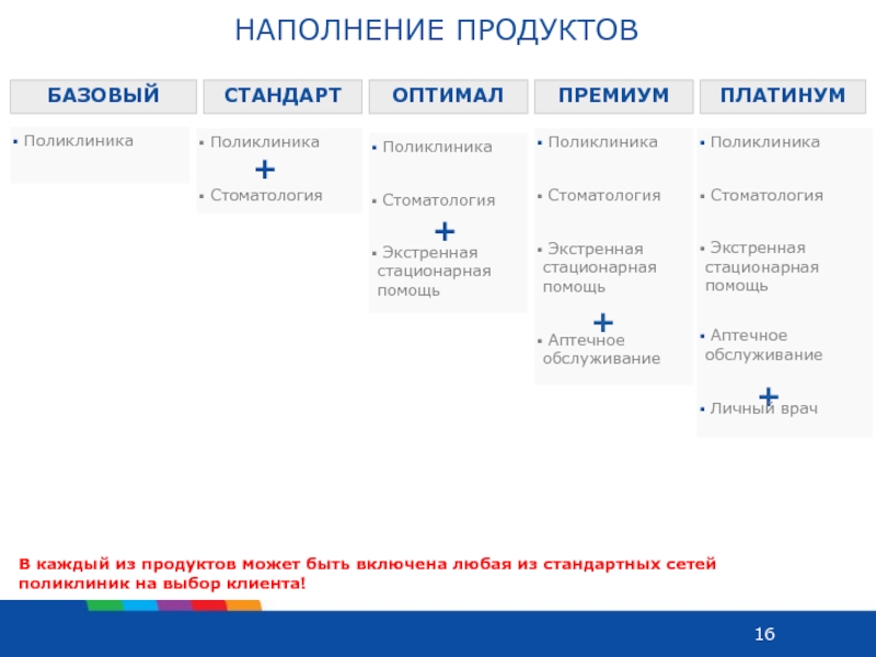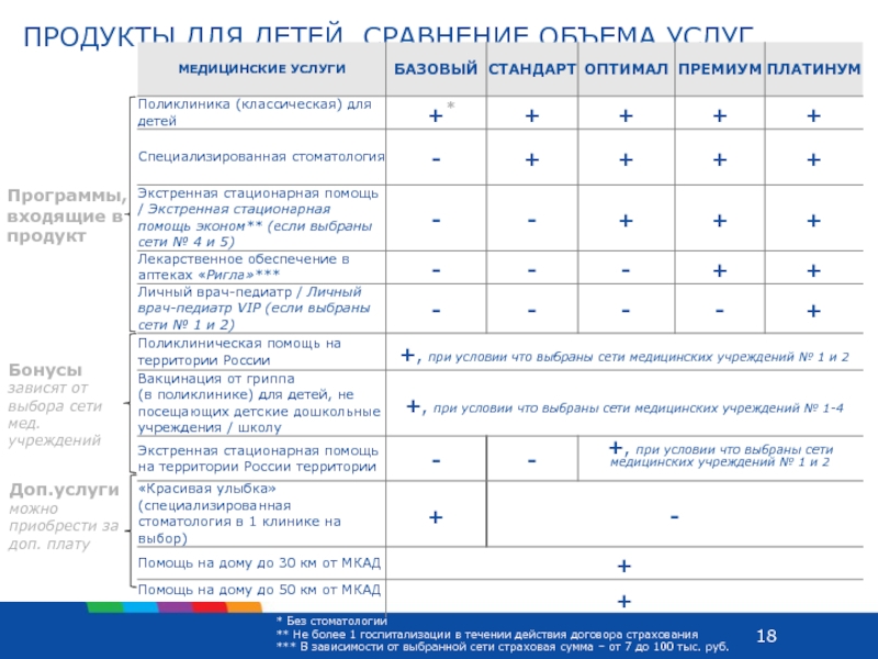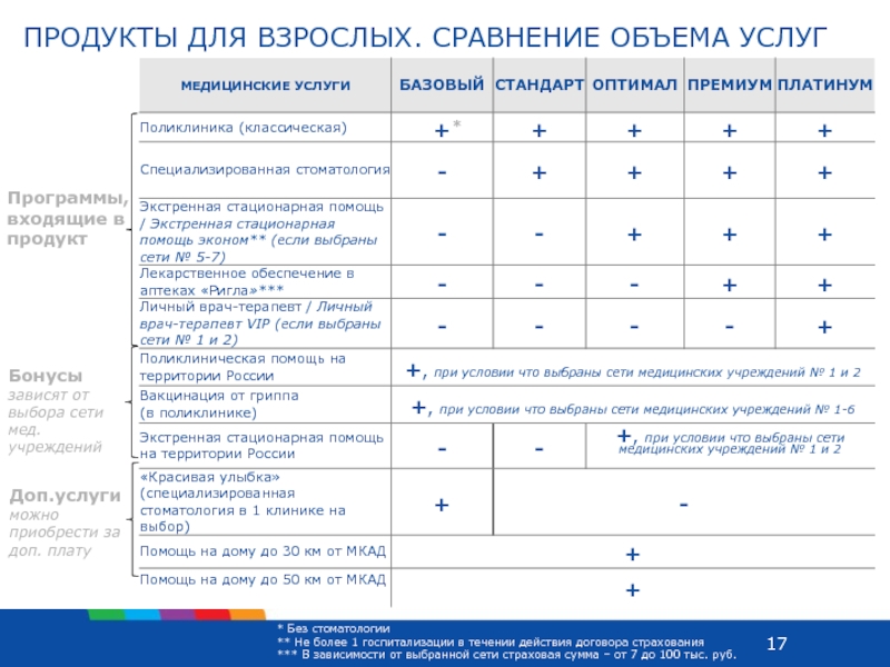 В зависимости от категории выбранной сети поликлиник объем услуг, входящих в продукты, будет увеличен (чем дороже сеть покупаешь, тем больше преференций имеешь в продукте)
