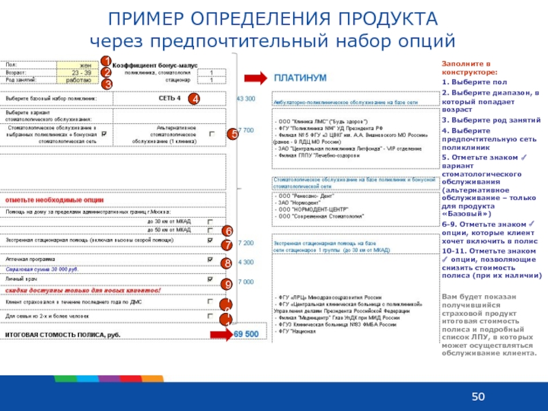Набор услуг, выбранных клиентом, определяет продукт, т.е. два варианта выбора продукта: «от продукта» (выбираем знакомый продукт, из цены подбираем к нему подходящую сеть ЛПУ) и «от предпочтений по содержимому» (через конструктор выбираем требуемый набор опций, узнаем, что за продукт в итоге получился)