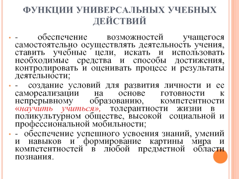 Слайд 9ФУНКЦИИ УНИВЕРСАЛЬНЫХ УЧЕБНЫХ ДЕЙСТВИЙ