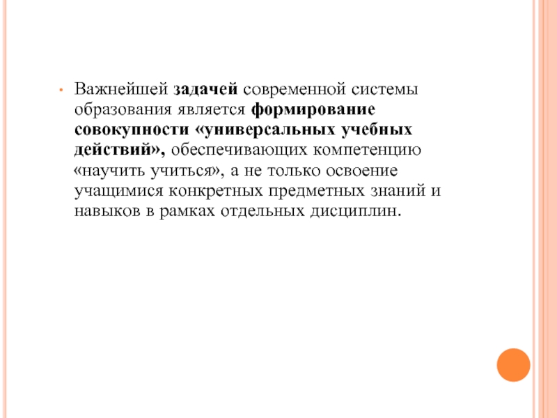 Слайд 6Важнейшей задачей современной системы образования является формирование совокупности «универсальных учебных действий»,