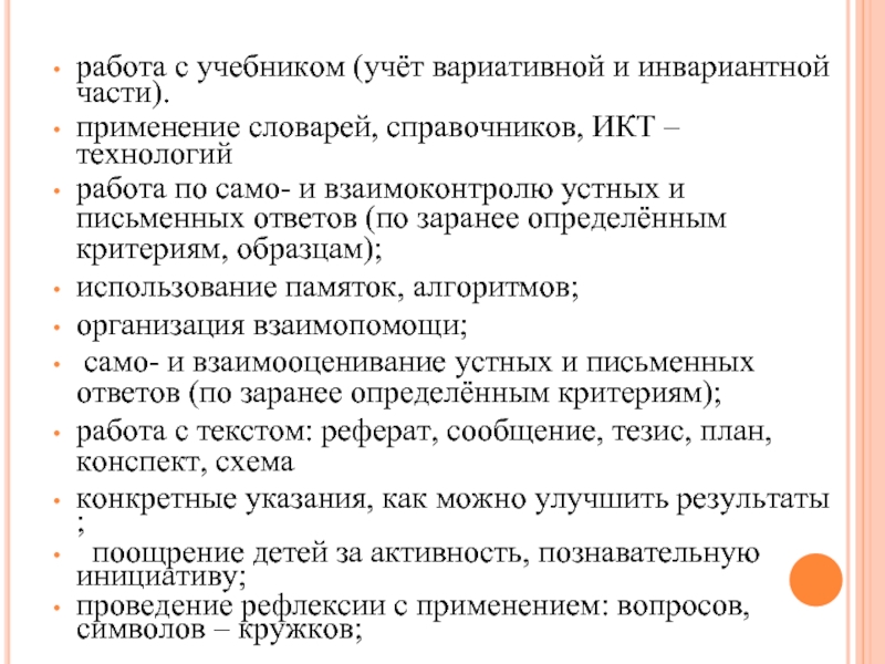 работа по само- и взаимоконтролю устных и письменных ответов (по заранее определённым критериям, образцам);
