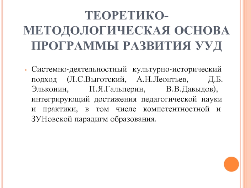 Слайд 10ТЕОРЕТИКО-МЕТОДОЛОГИЧЕСКАЯ ОСНОВА ПРОГРАММЫ РАЗВИТИЯ УУД