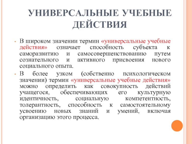 В более узком (собственно психологическом значении) термин «универсальные учебные действия» можно определить как совокупность действий учащегося, обеспечивающих его культурную идентичность, социальную компетентность, толерантность, способность к самостоятельному усвоению новых знаний и умений, включая организацию этого процесса.