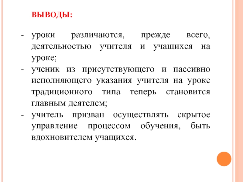 из присутствующего и пассивно исполняющего указания учителя на уроке традиционного типа теперь становится главным деятелем;