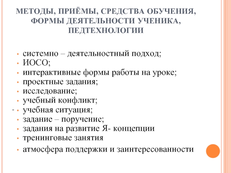 Слайд 19МЕТОДЫ, ПРИЁМЫ, СРЕДСТВА ОБУЧЕНИЯ, ФОРМЫ ДЕЯТЕЛЬНОСТИ УЧЕНИКА, ПЕДТЕХНОЛОГИИ