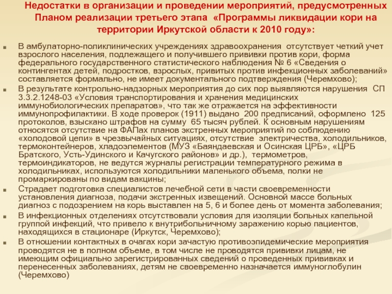 В амбулаторно-поликлинических учреждениях здравоохранения отсутствует четкий учет взрослого населения, подлежащего и получившего прививки против кори, форма федерального государственного статистического наблюдения № 6 «Сведения о контингентах детей, подростков, взрослых, привитых против инфекционных заболеваний» составляется формально, не имеет документального подтверждения (Черемхово);
