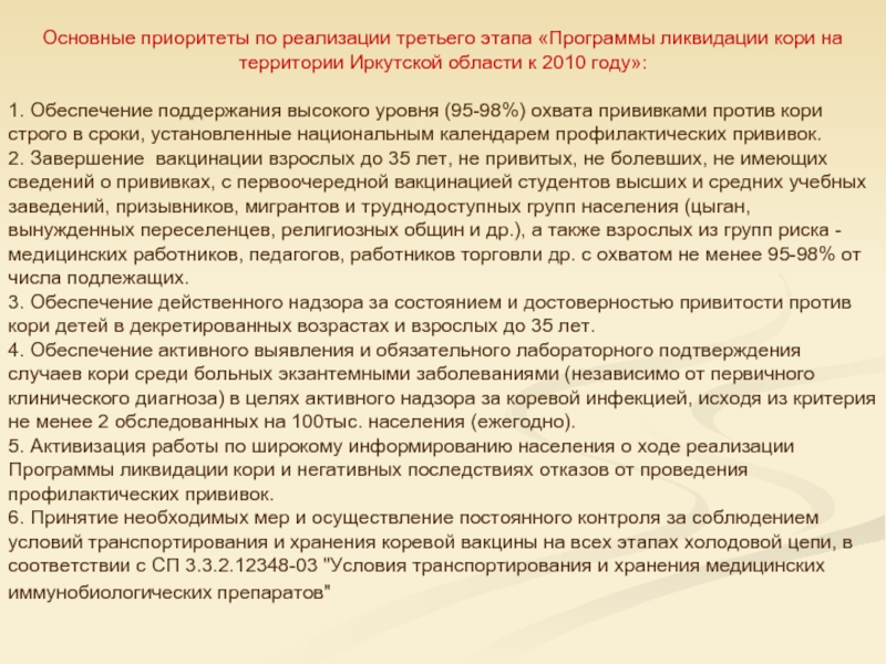В отношении контактных в очагах кори зачастую противоэпидемические мероприятия проводятся не в полном объеме, в том числе не проводятся прививки лицам, не имеющим официально зарегистрированных сведений о проведенных прививках и перенесенных заболеваниях, детям не своевременно назначается иммуноглобулин (Черемхово)