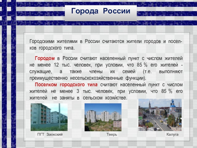 Городскими жителями в России считаются жители городов и посел-ков городского типа.