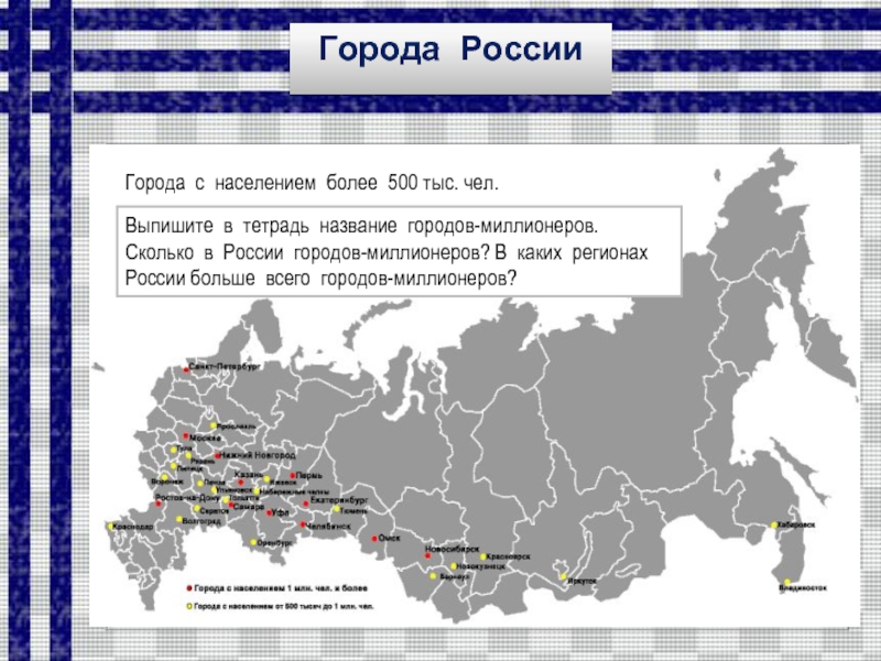 Выпишите в тетрадь название городов-миллионеров. Сколько в России городов-миллионеров? В каких регионах России больше всего городов-миллионеров?