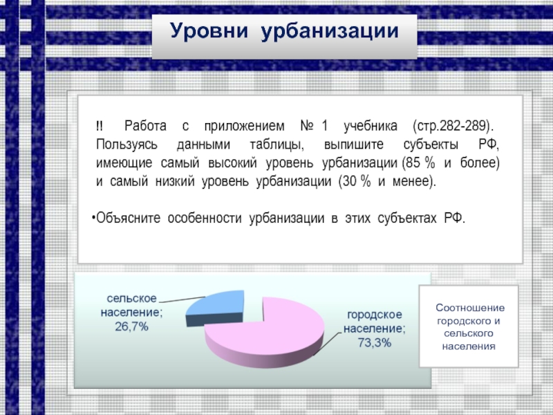 !! Работа с приложением № 1 учебника (стр.282-289). Пользуясь данными таблицы, выпишите субъекты РФ, имеющие самый высокий уровень урбанизации (85 % и более) и самый низкий уровень урбанизации (30 % и менее).