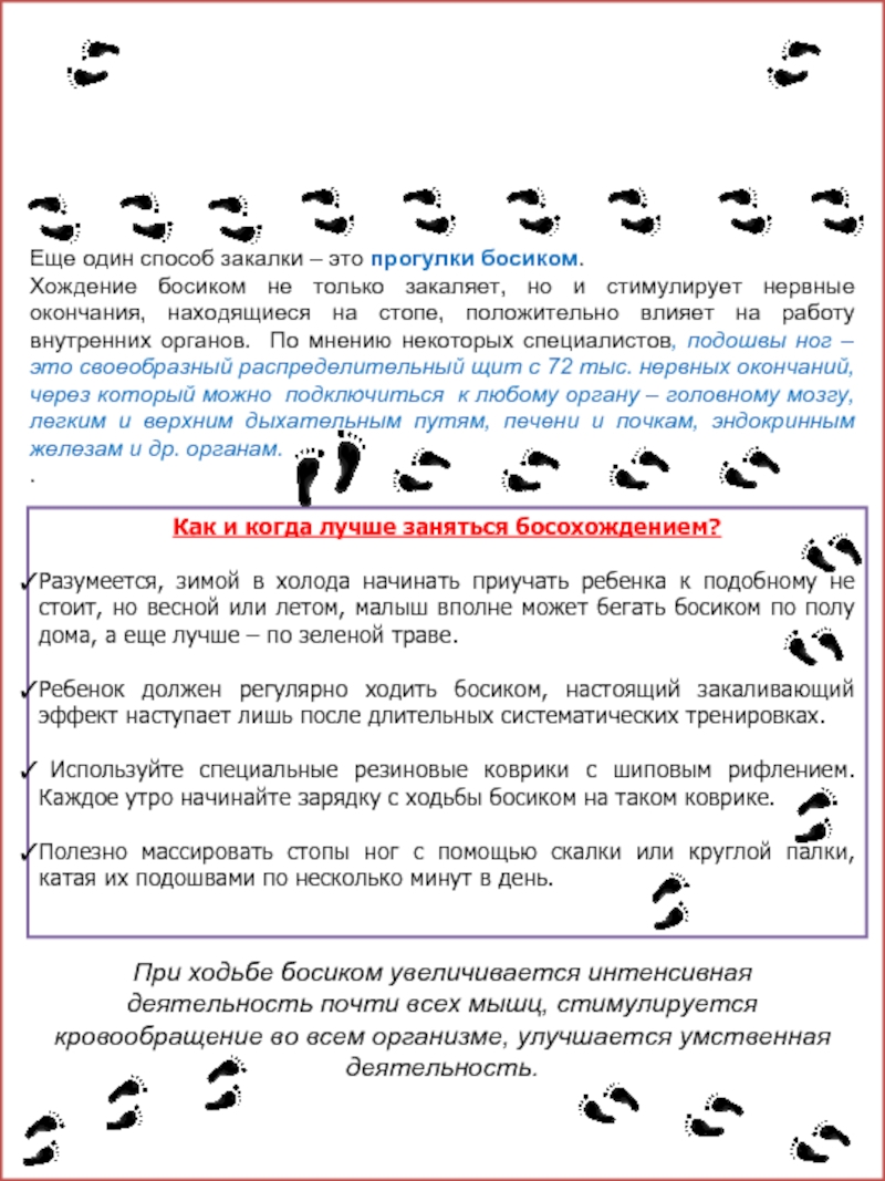 Хождение босиком не только закаляет, но и стимулирует нервные окончания, находящиеся на стопе, положительно влияет на работу внутренних органов. По мнению некоторых специалистов, подошвы ног – это своеобразный распределительный щит с 72 тыс. нервных окончаний, через который можно подключиться к любому органу – головному мозгу, легким и верхним дыхательным путям, печени и почкам, эндокринным железам и др. органам.