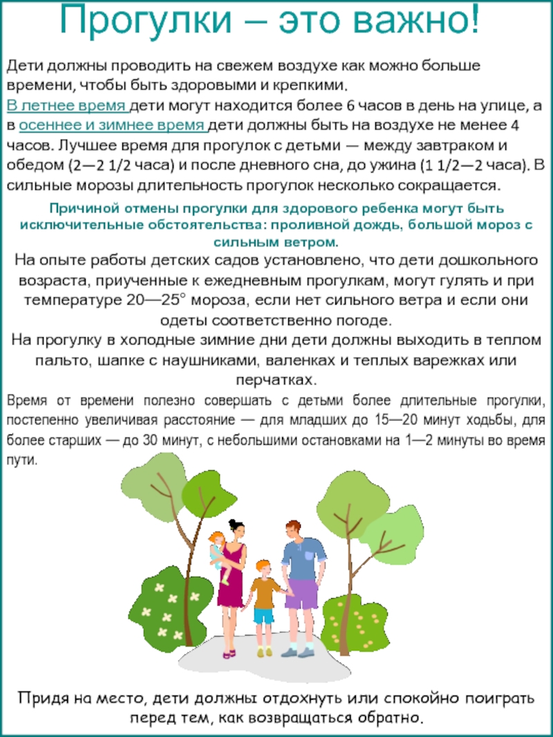 На опыте работы детских садов установлено, что дети дошкольного возраста, приученные к ежедневным прогулкам, могут гулять и при температуре 20—25° мороза, если нет сильного ветра и если они одеты соответственно погоде.