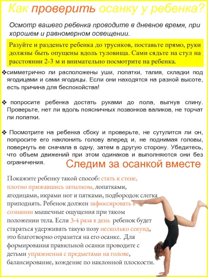 попросите ребенка достать руками до пола, выгнув спину. Проверьте, нет ли вдоль поясничных позвонков валиков, не торчат ли лопатки.