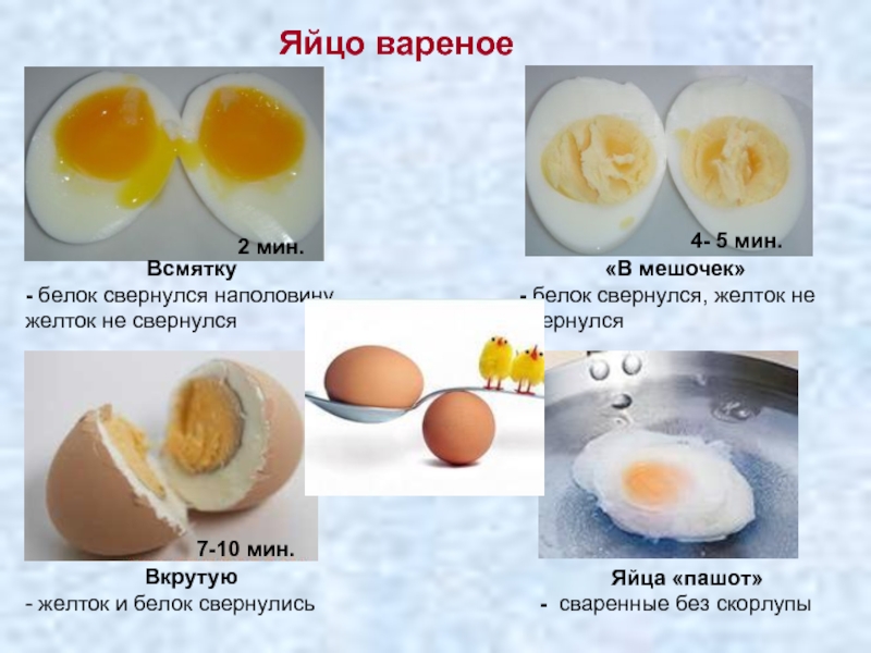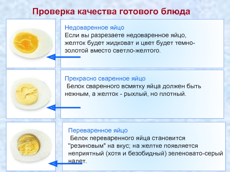 Белок переваренного яйца становится "резиновым" на вкус; на желтке появляется неприятный (хотя и безобидный) зеленовато-серый налет.