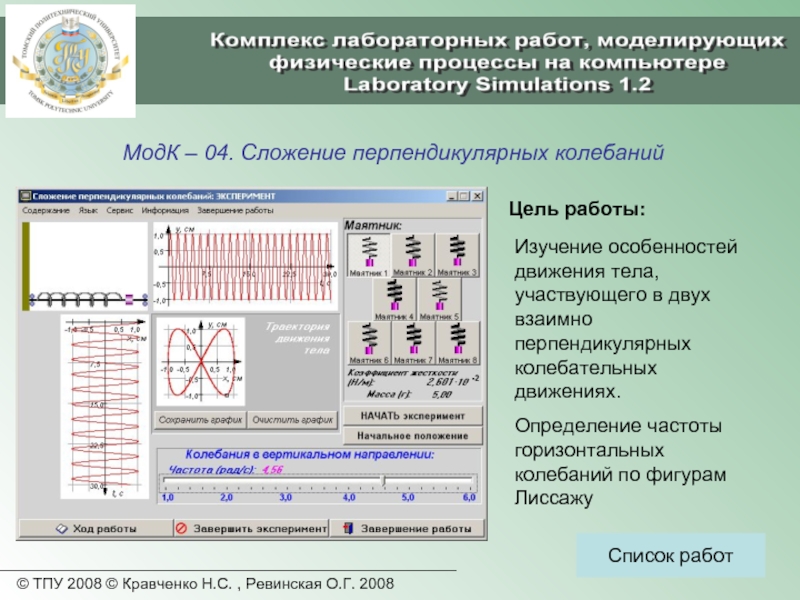 Изучение особенностей движения тела, участвующего в двух взаимно перпендикулярных колебательных движениях.