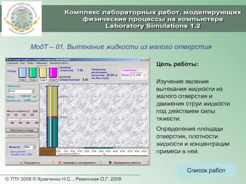 Изучение явления вытекания жидкости из малого отверстия и движения струи жидкости под действием силы тяжести.