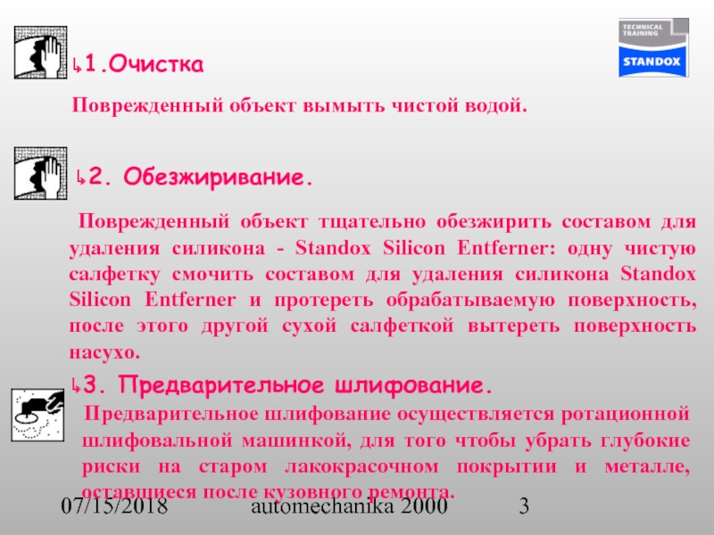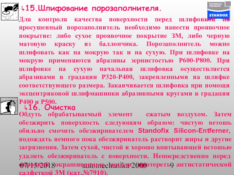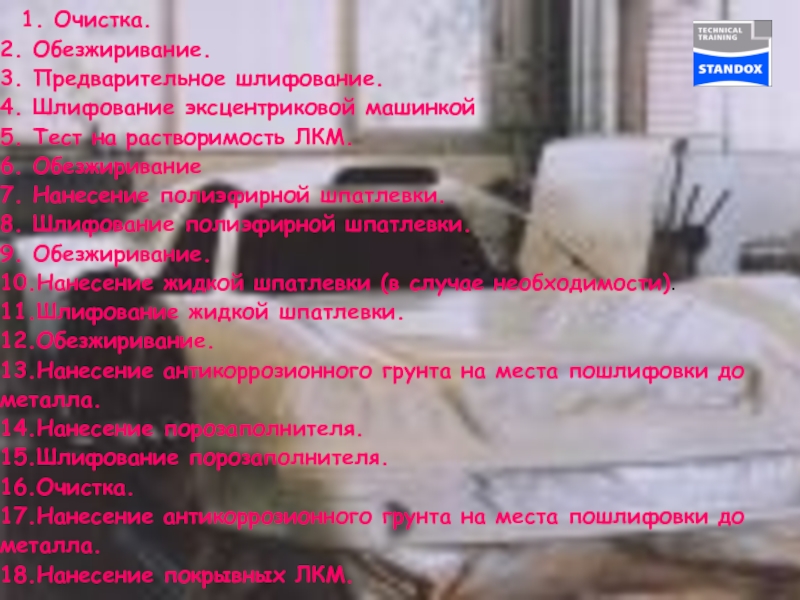 Обдуть обрабатываемый элемент сжатым воздухом. Затем обезжирить поверхность следующим образом: чистую ветошь обильно смочить обезжиривателем Standofix Silicon-Entferner, подождать немного пока обезжириватель растворит жиры и другие загрязнения. Затем сухой, чистой и хорошо впитывающей ветошью удалить обезжириватель с поверхности. Непосредственно перед окраской окрашиваемые детали протереть антистатической салфеткой 3М (кат.№7910).