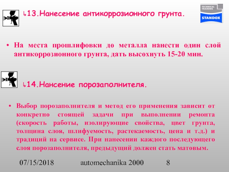 Выбор порозаполнителя и метод его применения зависит от конкретно стоящей задачи при выполнении ремонта (скорость работы, изолирующие свойства, цвет грунта, толщина слоя, шлифуемость, растекаемость, цена и т.д.) и традиций на сервисе. При нанесении каждого последующего слоя порозаполнителя, предыдущий должен стать матовым.