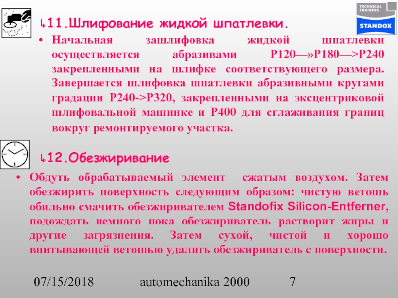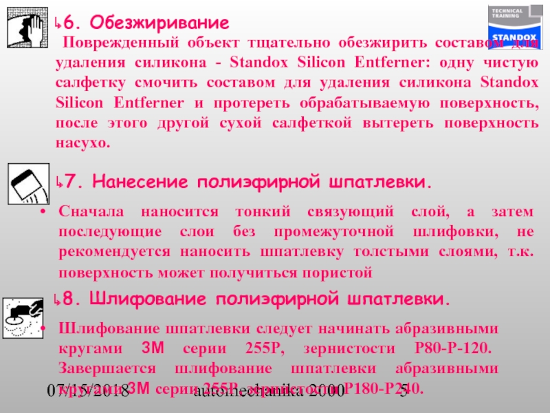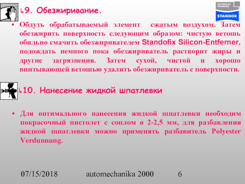 Обдуть обрабатываемый элемент сжатым воздухом. Затем обезжирить поверхность следующим образом: чистую ветошь обильно смачить обезжиривателем Standofix Silicon-Entferner, подождать немного пока обезжириватель растворит жиры и другие загрязнения. Затем сухой, чистой и хорошо впитывающей ветошью удалить обезжириватель с поверхности.