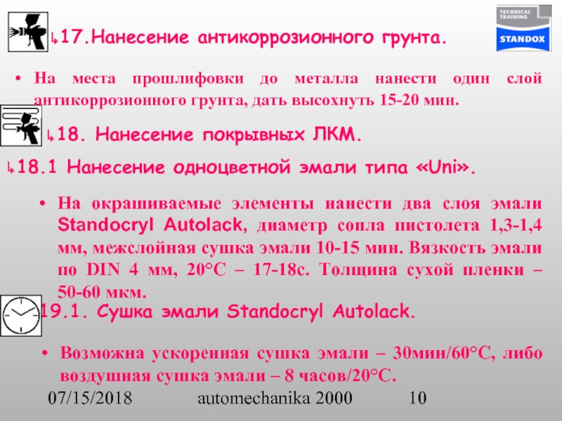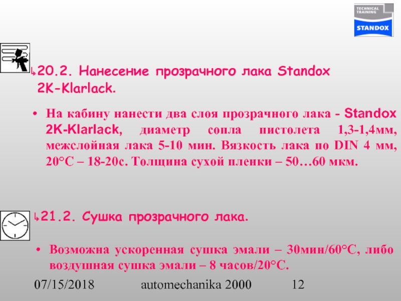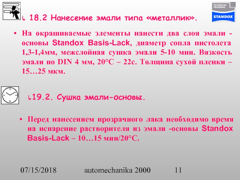 Перед нанесением прозрачного лака необходимо время на испарение растворителя из эмали -основы Standox Basis-Lack – 10…15 мин/20°С.