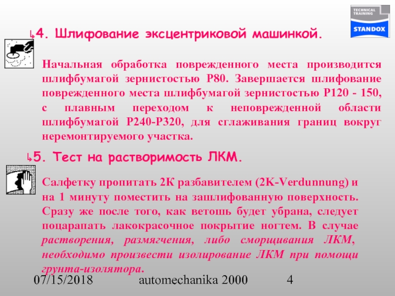 Салфетку пропитать 2К разбавителем (2K-Verdunnung) и на 1 минуту поместить на зашлифованную поверхность. Сразу же после того, как ветошь будет убрана, следует поцарапать лакокрасочное покрытие ногтем. В случае растворения, размягчения, либо сморщивания ЛКМ, необходимо произвести изолирование ЛКМ при помощи грунта-изолятора.