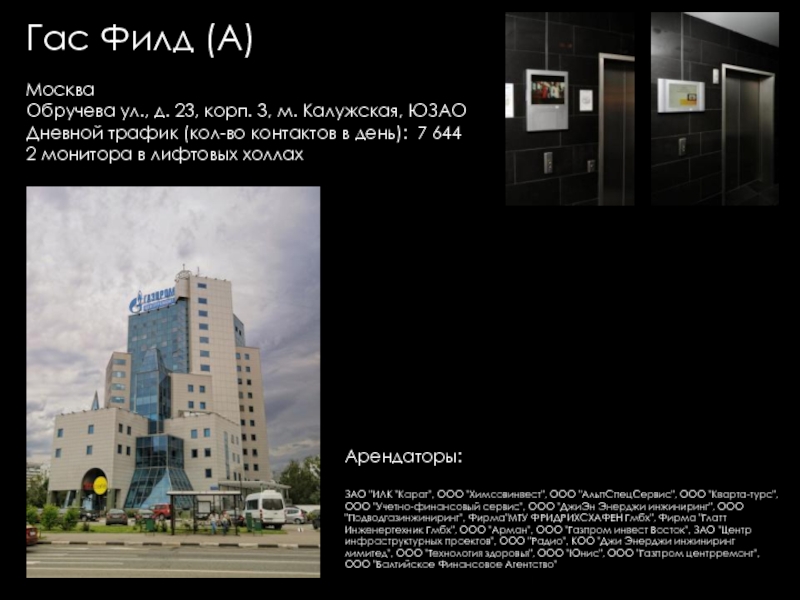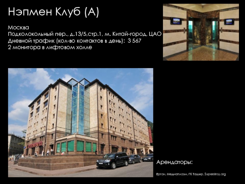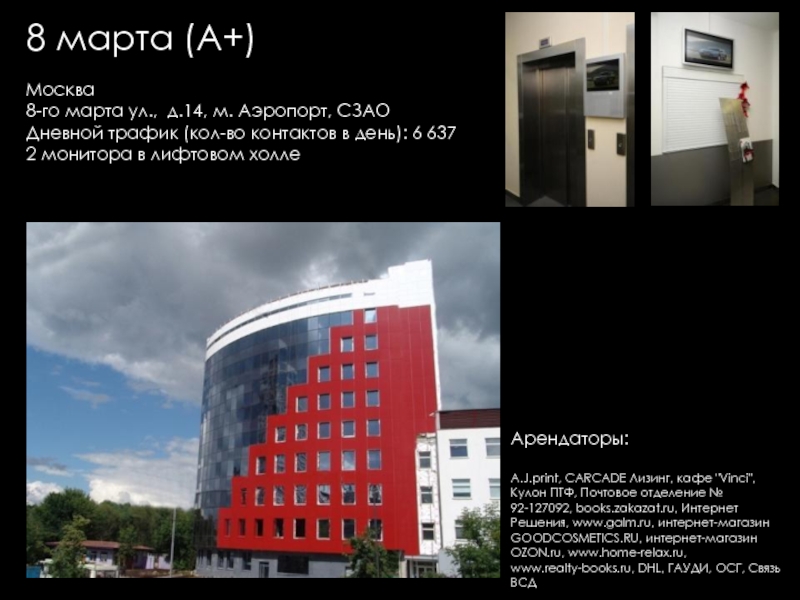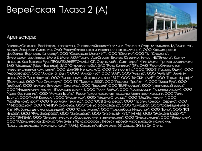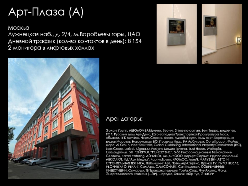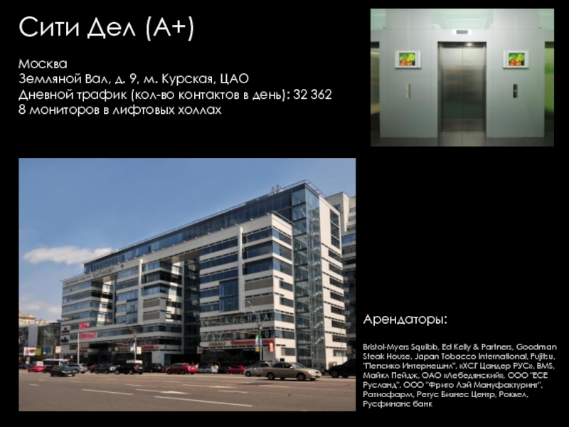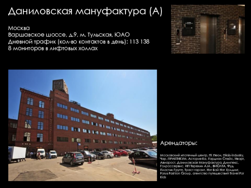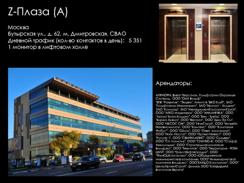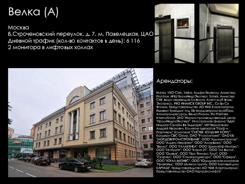 Групп, Евразхолдинг ТК, Интерлайн, Людовик институт Эстетики, Представительство KRKA, Универс-Аудит, Французская Стоматологическая клиника Элит Ав, Юлитекс, А & T Аудио, Атлантис Комьюникейшнз, Мастак Торговая Сеть, Акара, Би ТУ Три, Висат-Тел, Итс-ЭлектрогруппСистемы Кондиционирования ООО, Ситэс-Кондиционер 21, Ситэс-центр, Effective Solutions, Fcb Ma, Media Arts Group, Альтор Адвокатское Бюро, Дексиа банк (Моск. филиал), Комплекс Лизинг, Спецсплавиндустрия, Валес, "АВС" НП "ИПИР", "Авто Бутик", "Ин Энд Аут Медиа Сервис", "Институт корпоративного права", "Мерси", "Прованс Дистрибьюшн", "Промспецстрой", «Вейс», «ДжонсонДайверси» Россия, «Шикана», DC Group, Divizion, Marketing Solution, NHK, Авангард Стиль, Авионова, Анкор-Криомаш (Окси Фрост), Арктел, Артур-Хант, АТтрейд, Весса, Вск Центр, Дестим, Евраз-Холдинг, Елинский ПК, ЗАО "Виталмар АПРО", ЗАО "Дексиа Банк", ЗАО "ДС группа" "ДРС", ЗАО "Интерголд", ЗАО "Медиа артс групп", ЗАО "РЭНОМ", ЗАО "Сырьевой Комплекс", ЗАО "Уиллстрим", ЗАО «Media Arts Group», ЗАО «Группа предприятий АРМ», ЗАО «Дениз Банк Москва», ЗАО «Карнэт 2000», ЗАО «Нордмет-М», ЗОА «Форт-Аэро», ИнтерЛайн, Интерэктив, Кафе "Тико", КвадроПлюс, Клинский МПК, Компания «ДэЭс Груп», Компания «Лофт», Компания Дэстин, Крэско Фингаш, Марей (Фаер, Оптима-Бьюти, Альдо–Каппола), Московский Кредитный Банк, МПП Трейдинг (Клинский, Альбаторг), Нарцисс, Новая технология, Новотех, НП "НАПФ", ОАО "Интер-Лайн", ОАО "РТКомм", ОАО «Арктел», Огивли энд Мейзер, Окси Фрост, ООО "Автомобили Балтия-Москва", ООО "АРТ строй", ООО "Валес 21", ООО "Вильям Трандс", ООО "Все свои", ООО "Вуд Трейдинг", ООО "Ибериус", ООО "Комплекс лизинг", ООО "Конфаэль.Фирменная сеть", ООО "КСБ", ООО "Лира Групп", ООО "М+В Хай Тек Проджектс", ООО "Огилви энд Мейзер", ООО "Помпея-Рус", ООО "ТВР", ООО "Электросталь-Снаб", ООО «Валентин Юдашкин Торговый Дом», ООО «Вест-Пром», ООО «Интер Консалтинг Групп», ООО «Приладожье», ООО «РВК-Консалтинг», ООО «Скания Лизинг», Промтехимпекс (Сател), Пропаганда Огилви, РадосГрупп Девелопмент, РентаСтройТехника, Реферч Груп, Росводоканал, РТ Ком, Русский монолит (Пролетарский труд), Сенко – 21 век, Сибтранко («Крошка-картошка»), Строй Пром Сервис, Универсал Аудит, Уралхимпласт, Фест (Новера, Плазма Moscow), Шереметьево -4, Эвивалент, Эвитекс, Элайнс Гейминг («Супер Слот», AGS, Шторм), Элит АВ, Юридическая консультация, InfoWatch
