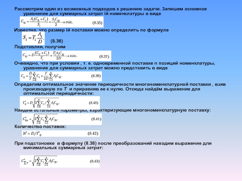 Очевидно, что при условии , т. е. одновременной поставке n позиций номенклатуры, уравнение для суммарных затрат можно представить в виде